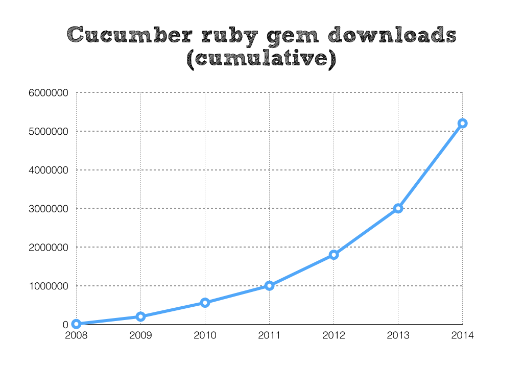 These numbers are only for the Ruby version. In addition to this there is also Cucumber-JVM, Cucumber-JS, Specflow and Behat (our two new official members of the cucumis probatius family) - all of which show similar patterns of growth.